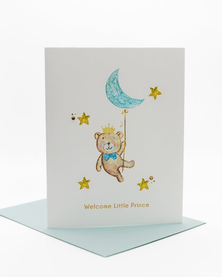 Welcome the little prince into the world with the 'Sweet Little Prince' New Baby Greeting Card from Lavender Vines! The teddy bear-inspired card is the perfect way to celebrate the arrival of this precious little blessing who's already stolen everyone's hearts. Lavender Vines new baby cards embody a sense of sweetness, love, and joy, making one of life's most cherished moments even more memorable. Inside message: You are already so loved and cherished, a little blessing from above! Each card measures 4.25 x 5.5 inches which is the standard A2 card size and includes a corresponding A2 envelope. Rhinestone gems and glitter. Each card is crafted with love and care, first printed on a premium, heavyweight cardstock and then embellished by hand with glitter and rhinestone gems.