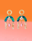 Veteran. Minority. Women owned. Empowering women and sparking joy through the use of color. BRAND VALUES Illuminating Independence. Equality for all. Ethical Work Opportunities. Promoting Self-Care. Spreading Knowledge. Product Details: A neutral yet kinda bold finishing touch to any outfit, these earrings are a glamorous abstract statement. Features: Vacation earrings, statement earrings, weddings and special events Materials: gold plated glass charms , resin hypoallergenic post Size: 2.5" tall and 2.5" wide. Made in United States.