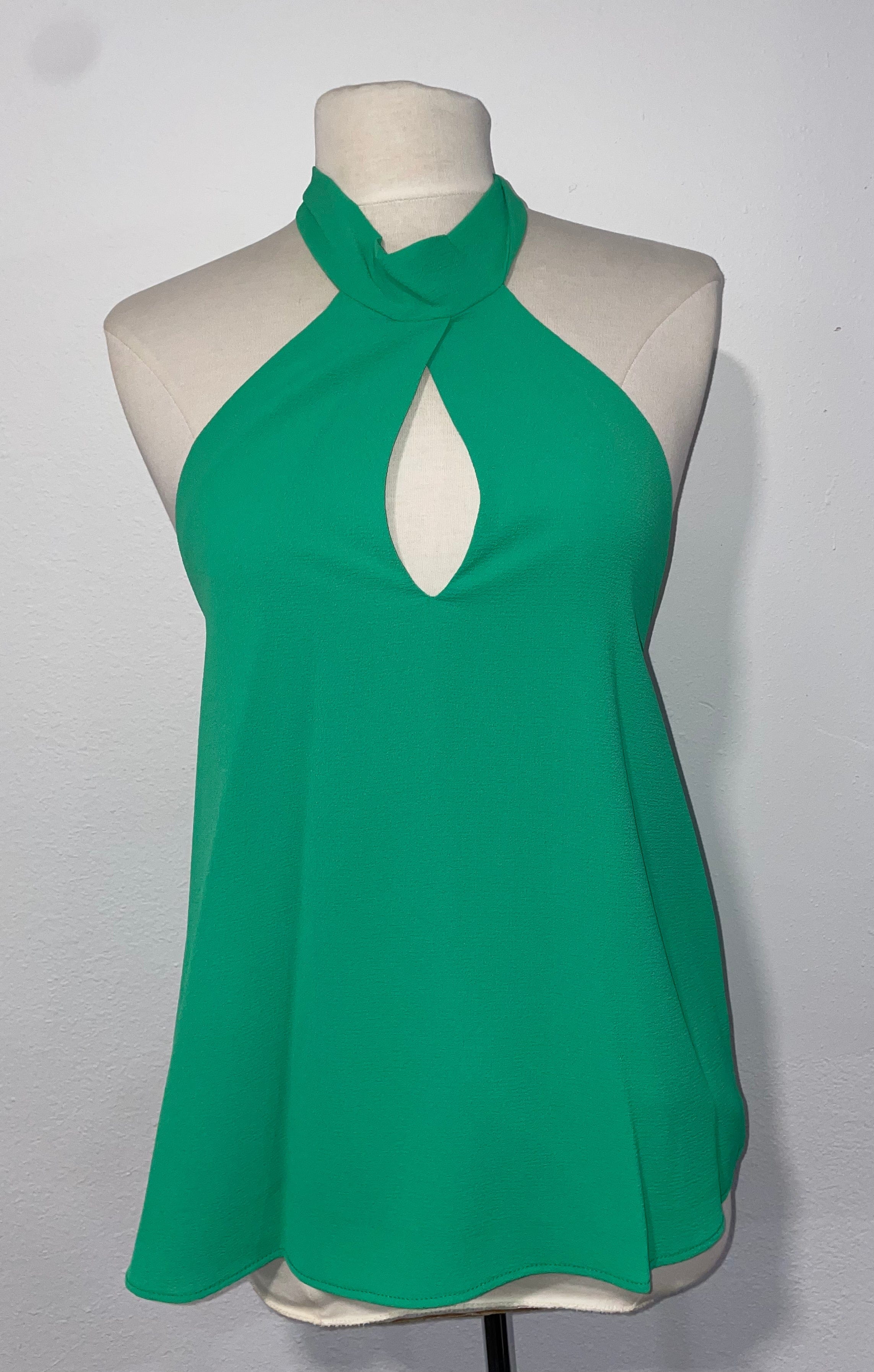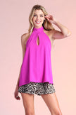 This gorgeous top features a halter neckline adorned with a unique keyhole detail. The halter closes behind the neck with a tie that can be styled to your liking. The backline is lined with elastic to keep you comfortable from day to night. Elevate any look with this timeless top.