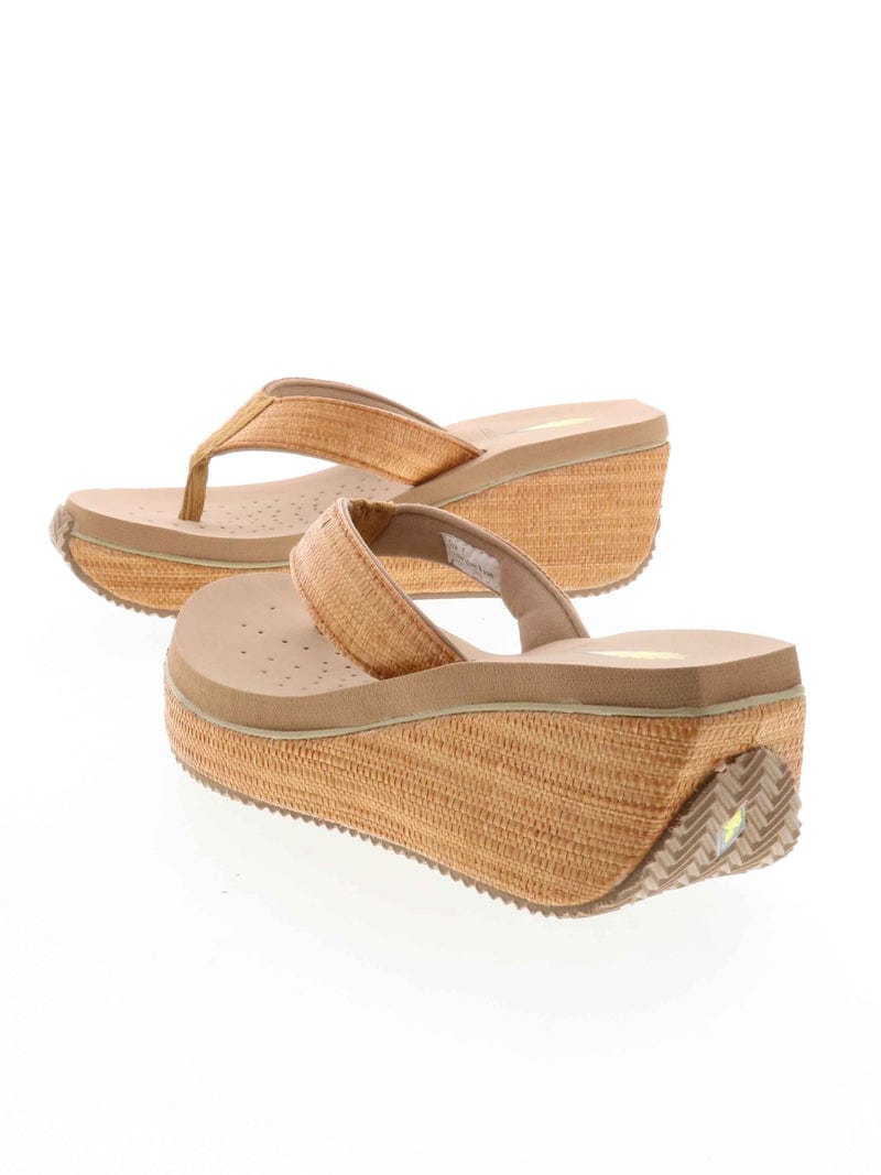 The 'Bahama' thong sandal by Volatile is crafted in woven textile and set on a sturdy platform wedge covered in the same material. Our signature ultra-comfort EVA insole will keep toes happy all day long and the rubber traction outsole provides extra stability. Wear them with patterned dresses or denim shorts.