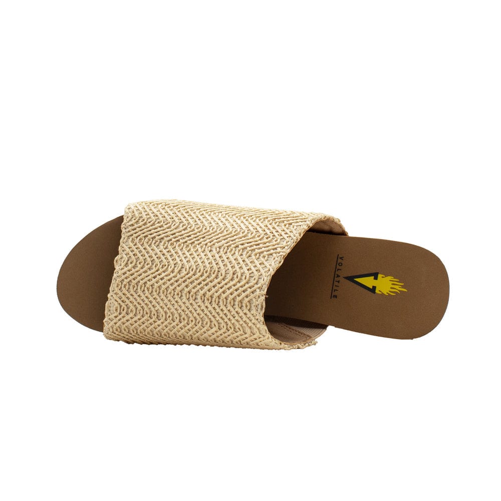 Volatile's Canteen Sandal has a unique woven synthetic raffia upper with metallic finish that is perfect for dressing up or down. Wear it with casual jeans or a fancy dress.