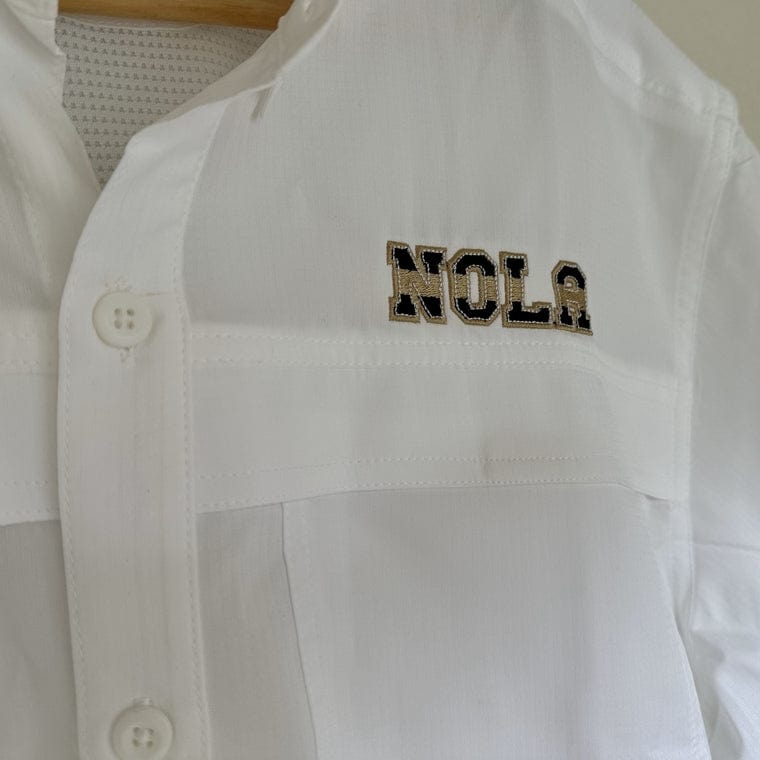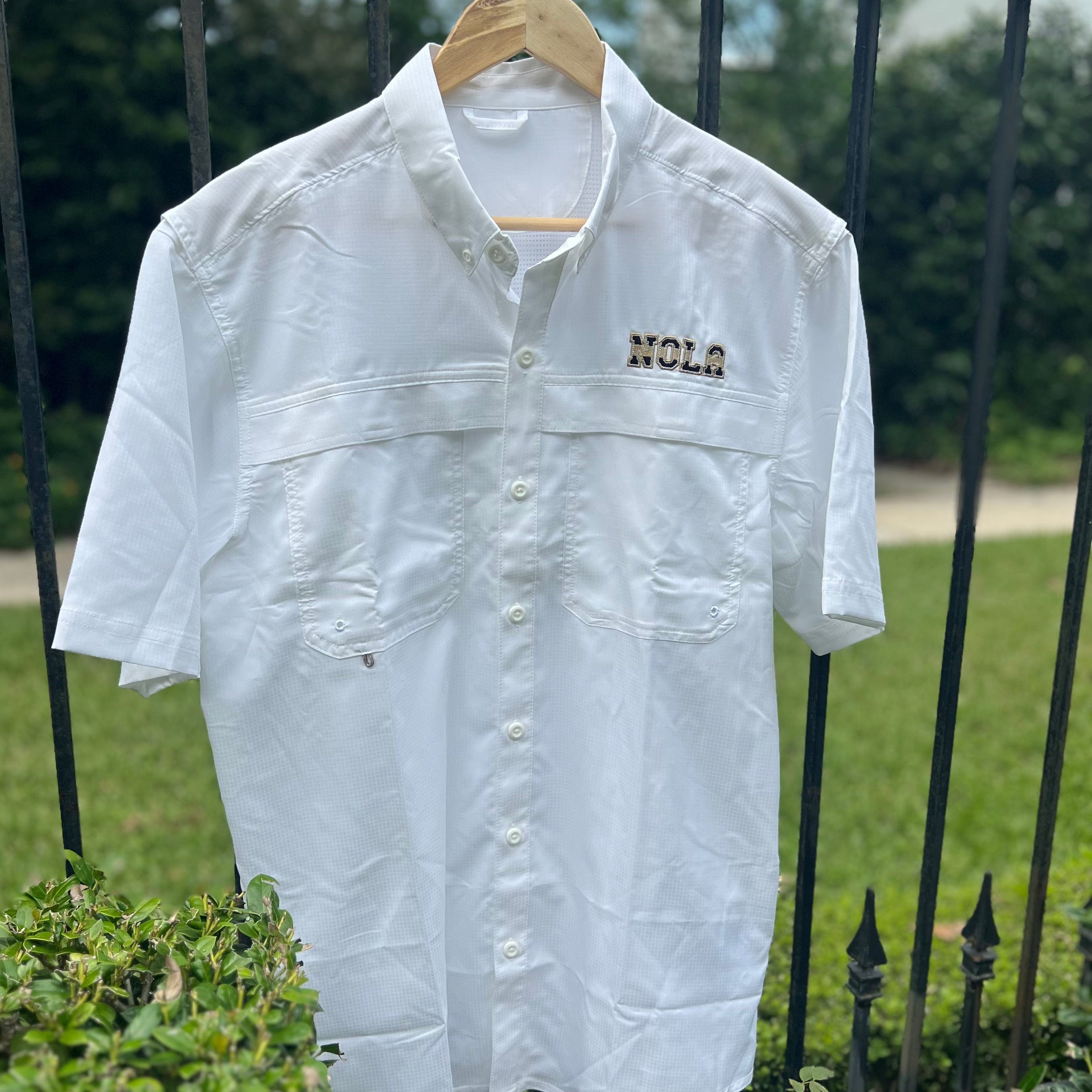 Our WHEREable Art NOLA Fishing Shirt is a men's button-down protective gear designed for optimal outdoor performance. Crafted with UPF sun protection, this fishing shirt offers all-day defense from harsh UV rays while also providing a stylish look with its special features, such as the black and gold NOLA applique.