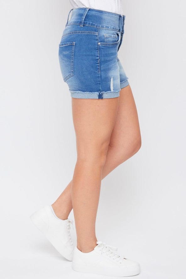 The perfect pair of shorts to add to your wardrobe! The Basic 3 Button Fray Cuff Shorts gives you the perfect combination of trendy and comfy! Designed with an exposed 3-button design, cuffed hems, and light distressing to add a little edge. Made with a super stretchy and comfortable denim that moves with you throughout the day. Pair these with your favorite tee and sneakers for an easy-going look, or dress them up with a blouse and booties! Product Details - High-Rise - 3-Button Closure with Zipper - 5 Pocket Construction - Light Distressing - Cuffed Hems Size & Fit (based on size 8) - Inseam: 5" - Rise: 11" - Leg Opening: 23" - Model is wearing a size 4 Hand wash cold. Line dry. 73% Cotton/ 25% Polyester/ 2% Spandex
